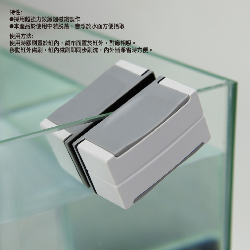 本產品經特殊設計,一改以往傳統磁鐵刷之缺點,集所有優點於一身,材質堅軔、重量輕盈、能浮於水面、磁力超強、不傷玻璃