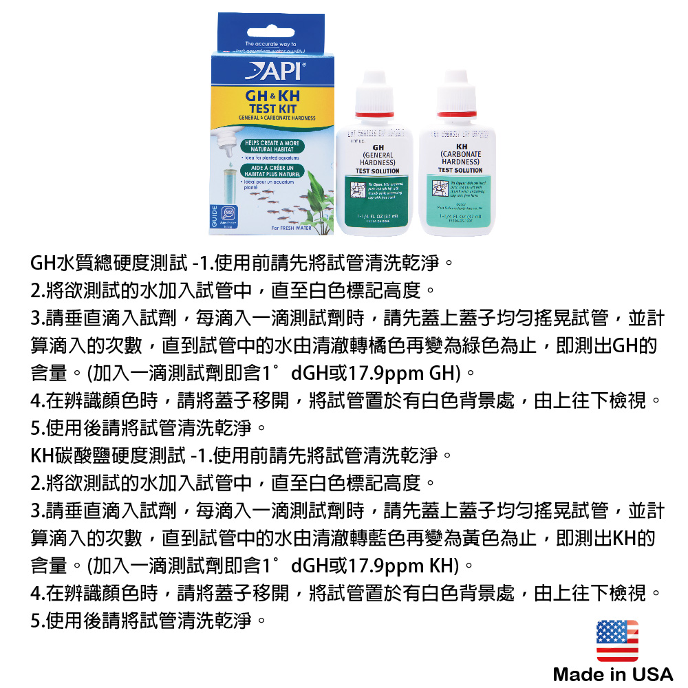 1.使用前請先將試管清洗乾淨2.將欲測試的水加入試管中,直至白色標記高度3.請垂直滴入試劑,每滴入一滴測試劑時,請先蓋上蓋子均勻搖晃試管,並計算滴入的次數,直到試管中的水由清澈轉橘色再變為綠色為止,即測出GH的含量。(加入一滴測試劑即含1∘dGH 或 17.9 ppm GH)。4.在辨識顏色時,請將蓋子移開,將試管置於有白色背景處,由上往下檢視5.使用後請將試管清洗乾淨
