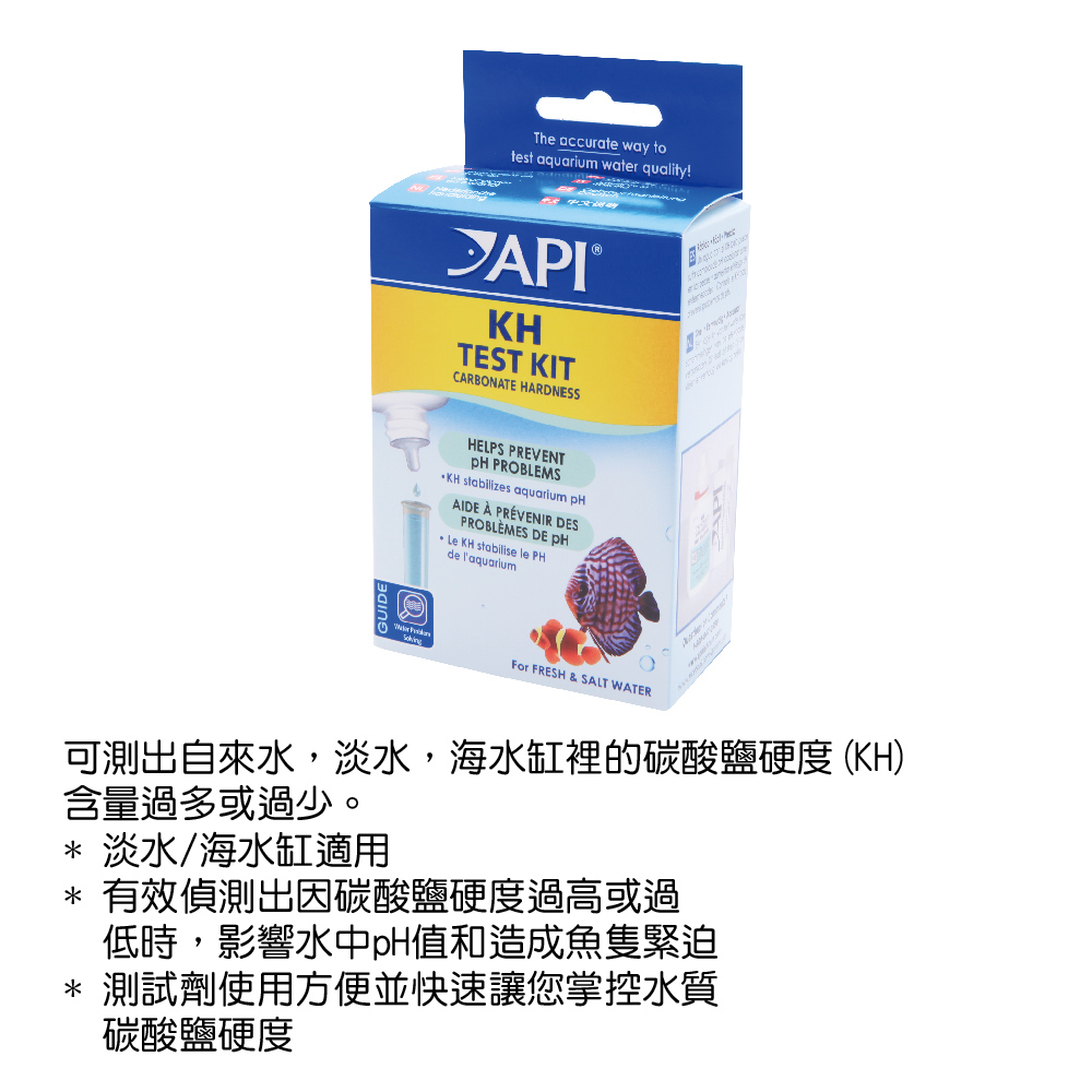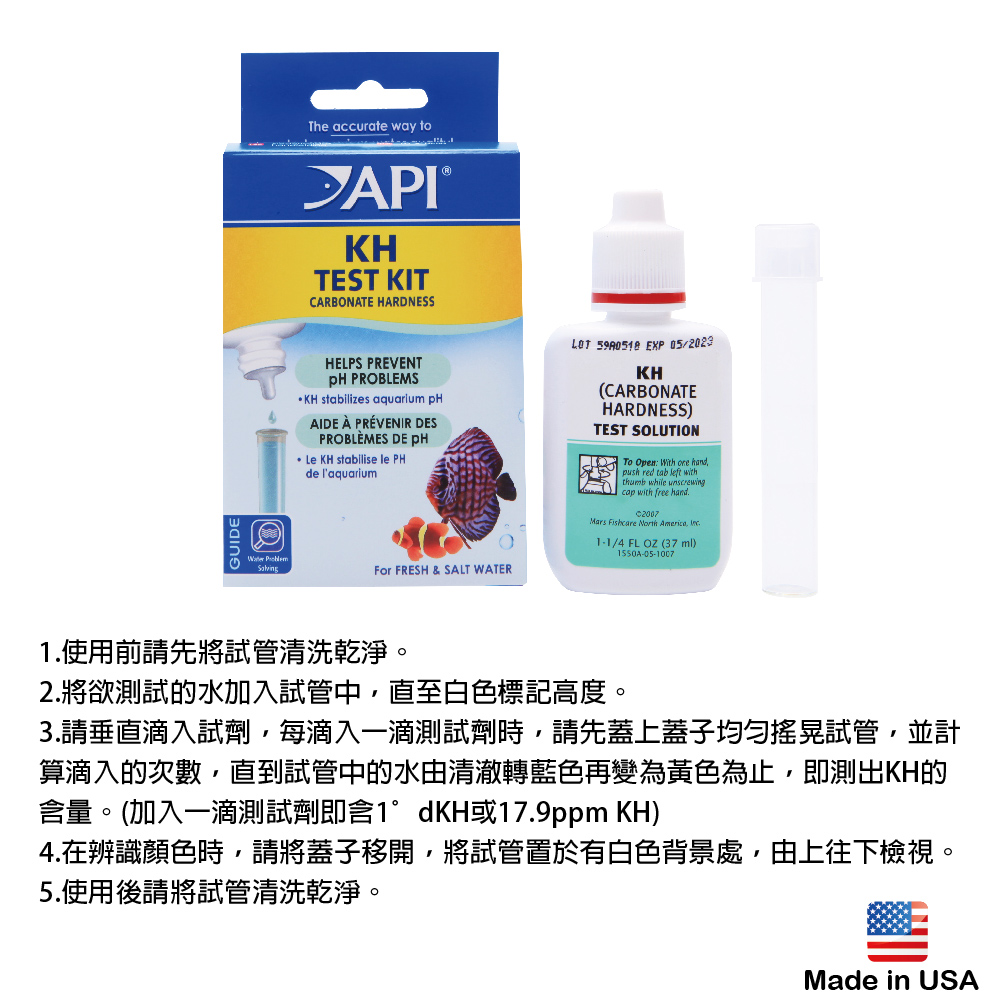 1.使用前請先將試管清洗乾淨2.將欲測試的水加入試管中,直至白色標記高度3.請垂直滴入試劑,每滴入一滴測試劑時,請先蓋上蓋子均勻搖晃試管,並計算滴入的次數,直到試管中的水由清澈轉藍色再變為黃色為止,即測出KH的含量。 (加入一滴測試劑即含1∘dKH 或 17.9 ppm KH)。4.在辨識顏色時,請將蓋子移開,將試管置於有白色背景處,由上往下檢視5.使用後請將試管清洗乾淨