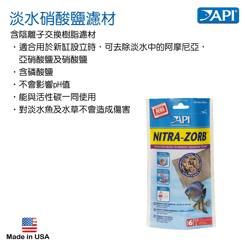 含陰離子交換樹脂濾材˙極適合用於新缸設立時,可去除淡水中的阿摩尼亞,亞硝酸鹽及硝酸鹽˙含磷酸鹽˙不會影響pH值˙對淡水魚及水草不會造成傷害
